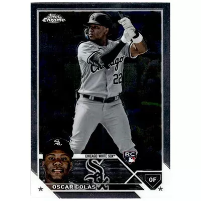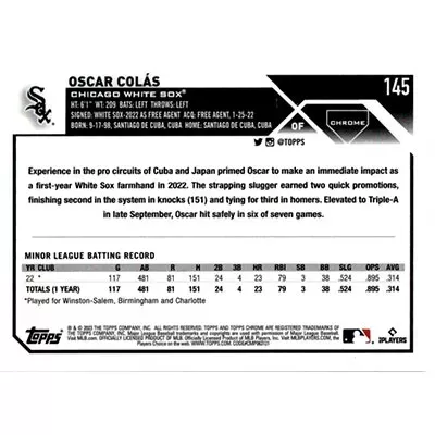 This is a 2023 Topps Chrome Oscar Colas baseball card. The card is #145 and is in NM-MT condition.
