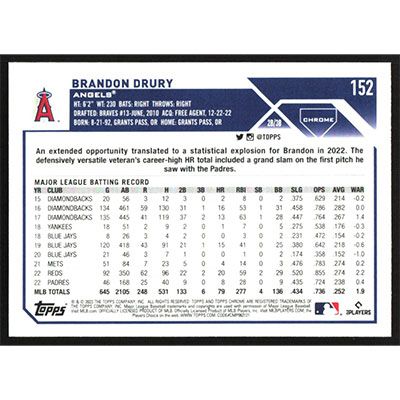 This is a 2023 Topps Chrome Brandon Drury baseball card. The card is #152 and pictures show condition.
