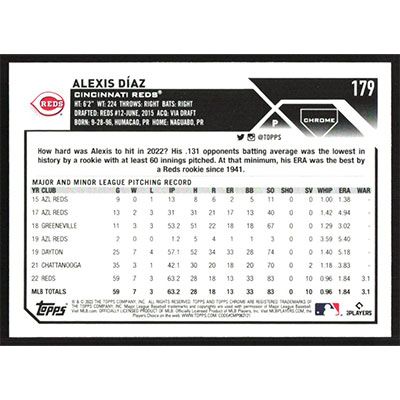 This is a 2023 Topps Chrome Alexis Diaz baseball card. The card is #179 and pictures show condition.