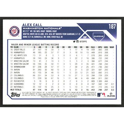 This is a 2023 Topps Chrome Alex Call baseball card. The card is #187 and pictures show condition.