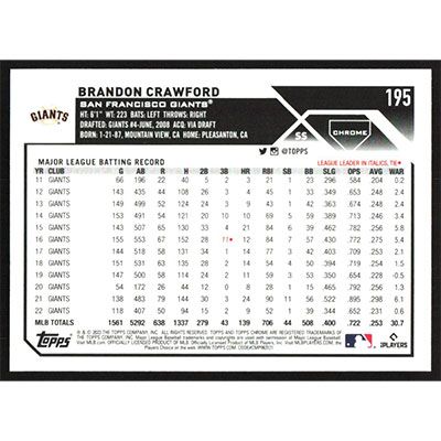 This is a 2023 Topps Chrome Brandon Crawford baseball card. The card is #195 and pictures show condition.