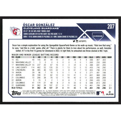 This is a 2023 Topps Chrome Oscar Gonzalez baseball card. The card is #207 and pictures show condition.