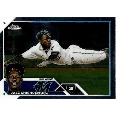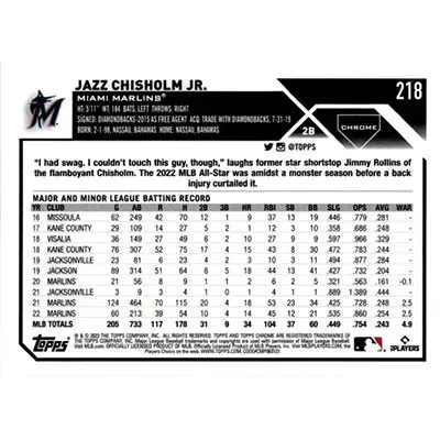 This is a 2023 Topps Chrome Jazz Chisholm Jr. baseball card. The card is #218 and is in NM-MT condition.
