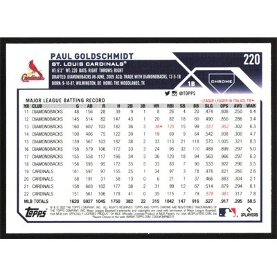 This is a 2023 Topps Chrome Paul Goldschmidt baseball card. The card is #220 and pictures show condition.