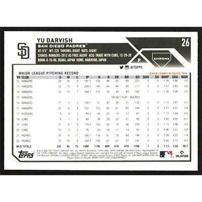 This is a 2023 Topps Chrome Yu Darvish baseball card. The card is #26 and pictures show condition.