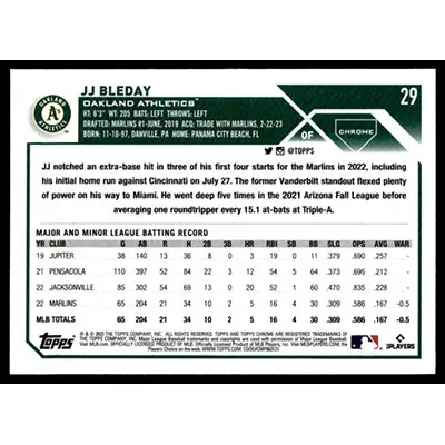 This is a 2023 Topps Chrome JJ Bleday baseball card. The card is #29 and is in NM-MT condition.