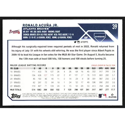This is a 2023 Topps Chrome Ronald Acuña Jr. baseball card. The card is #39 and pictures show condition.