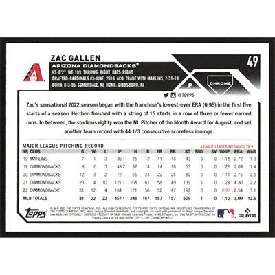 This is a 2023 Topps Chrome Zac Gallen baseball card. The card is #49 and pictures show condition.