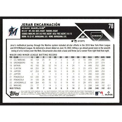 This is a 2023 Topps Chrome Jerar Encarnacion baseball card. The card is #78 and pictures show condition.