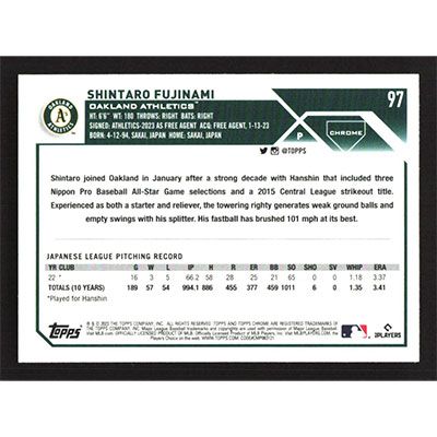 This is a 2023 Topps Chrome Shintaro Fujinami baseball card. The card is #97 and pictures show condition. Team(s): Oakland Athletics Rookie Card (RC)