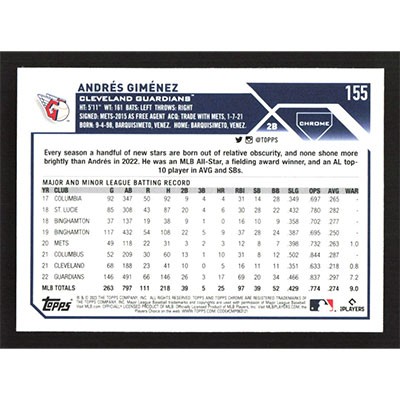 This is a 2023 Topps Chrome Pink Refractors Andres Gimenez baseball card. The card is #155 and pictures show condition.