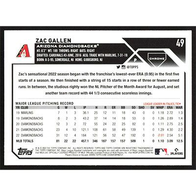 This is a 2023 Topps Chrome Pink Refractors Zac Gallen baseball card. The card is #49 and pictures show condition.