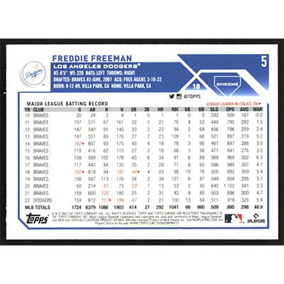 This is a 2023 Topps Chrome Pink Refractors Freddie Freeman baseball card. The card is #5 and pictures show condition.