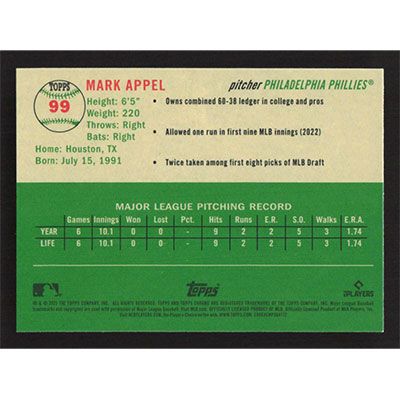 This is a 2023 Topps Chrome Platinum Anniversary Mark Appel baseball card. The card is #99 and pictures show condition. Team(s): Philadelphia Phillies Rookie Card (RC)