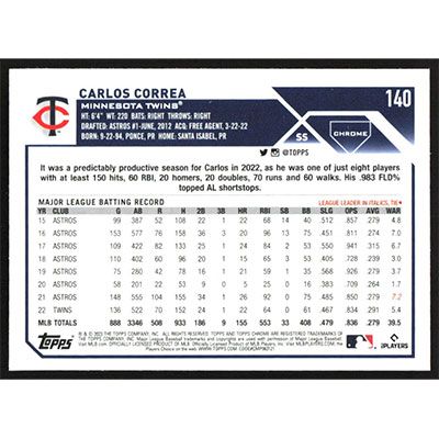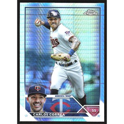 This is a 2023 Topps Chrome Prism Refractors Carlos Correa baseball card. The card is #140 and pictures show condition.