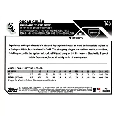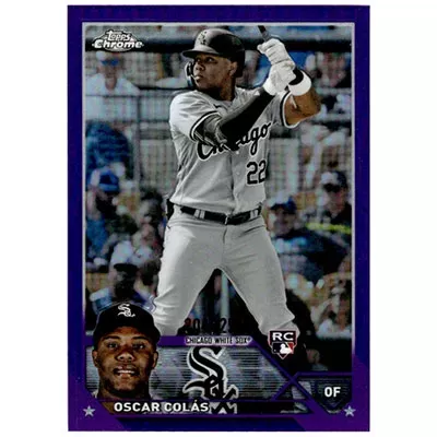 This is a 2023 Topps Chrome Purple Refractors Oscar Colas baseball card. The card is #145 and is in NM-MT condition. This card is limited; #'d out of /250.