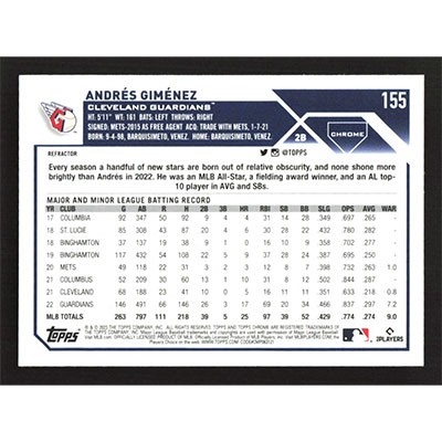 This is a 2023 Topps Chrome Refractors Andres Gimenez baseball card. The card is #155 and pictures show condition.