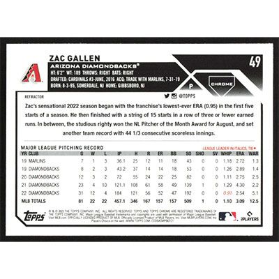 This is a 2023 Topps Chrome Refractors Zac Gallen baseball card. The card is #49 and pictures show condition.