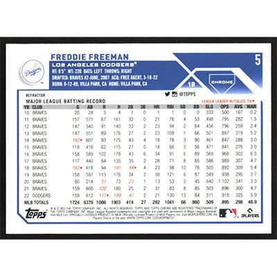 This is a 2023 Topps Chrome Refractors Freddie Freeman baseball card. The card is #5 and pictures show condition.