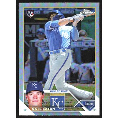 This is a 2023 Topps Chrome Refractors Nate Eaton baseball card. The card is #96 and pictures show condition. Team(s): Kansas City Royals Rookie Card (RC)