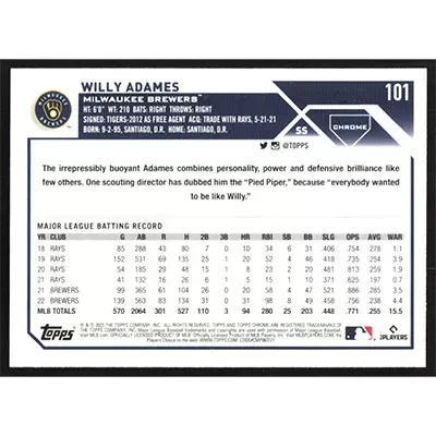 This is a 2023 Topps Chrome Sepia Refractors Willy Adames baseball card. The card is #101 and pictures show condition.