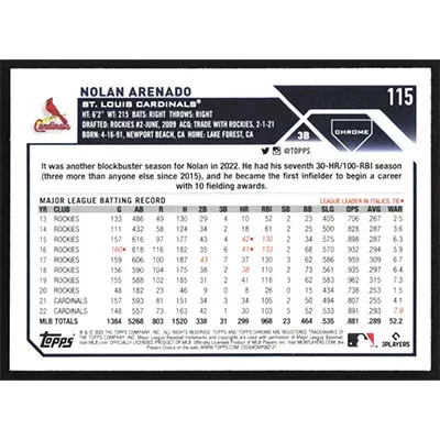 This is a 2023 Topps Chrome Sepia Refractors Nolan Arenado baseball card. The card is #115 and pictures show condition.