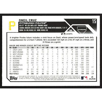 This is a 2023 Topps Chrome Sepia Refractors Oneil Cruz baseball card. The card is #15 and pictures show condition.
