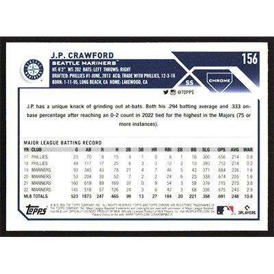 This is a 2023 Topps Chrome Sepia Refractors J.P. Crawford baseball card. The card is #156 and pictures show condition.