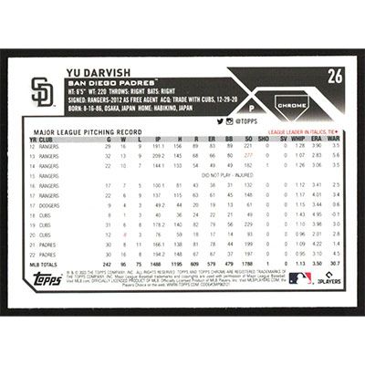 This is a 2023 Topps Chrome Sepia Refractors Yu Darvish baseball card. The card is #26 and pictures show condition.