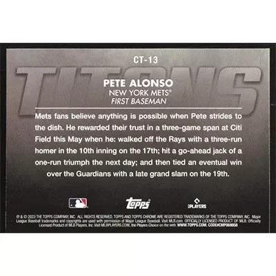 This is a 2023 Topps Chrome Titans Pete Alonso baseball card. The card is #CT-13 and pictures show condition.