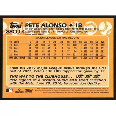 This is a 2023 Topps Chrome Update '88 Pete Alonso baseball card. The card is #88CU-4 and pictures show condition.