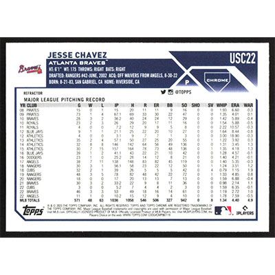 This is a 2023 Topps Chrome Update Refractors Jesse Chavez baseball card. The card is #USC22 and pictures show condition.