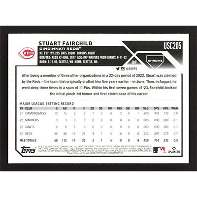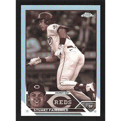 This is a 2023 Topps Chrome Update Sepia Refractors Stuart Fairchild baseball card. The card is #USC205 and pictures show condition. Team(s): Cincinnati Reds