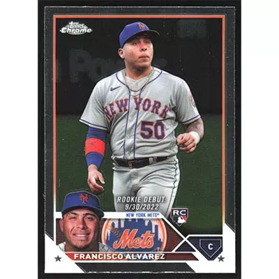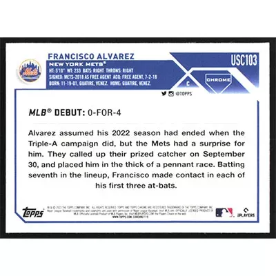 This is a 2023 Topps Chrome Update Francisco Alvarez Rookie Debut baseball card. The card is #USC103 and pictures show condition. Team(s): New York Mets Rookie Card (RC)