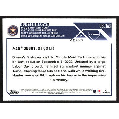 This is a 2023 Topps Chrome Update Hunter Brown Rookie Debut baseball card. The card is #USC163 and pictures show condition. Team(s): Houston Astros Rookie Card (RC)