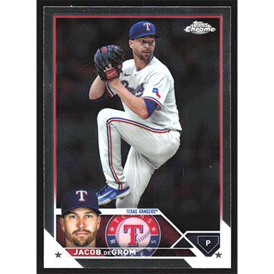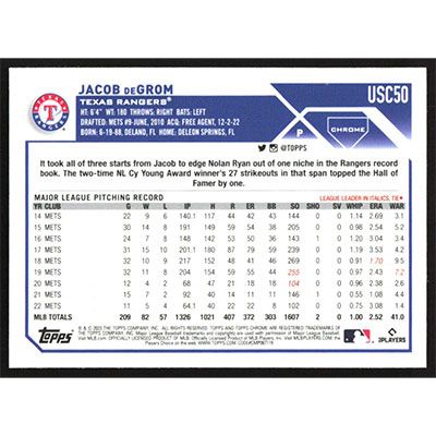 This is a 2023 Topps Chrome Update Jacob deGrom baseball card. The card is #USC50 and pictures show condition.