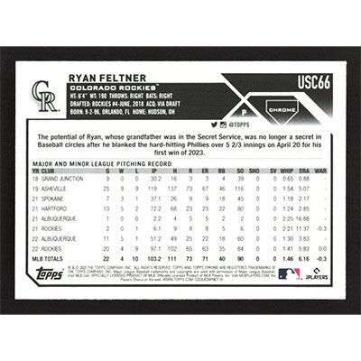 This is a 2023 Topps Chrome Update Ryan Feltner baseball card. The card is #USC66 and pictures show condition.