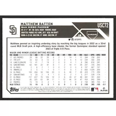 This is a 2023 Topps Chrome Update Matthew Batten baseball card. The card is #USC72 and pictures show condition. Team(s): San Diego Padres Rookie Card (RC)