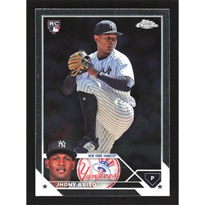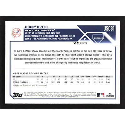 This is a 2023 Topps Chrome Update Jhony Brito baseball card. The card is #USC81 and pictures show condition. Team(s): New York Yankees Rookie Card (RC)