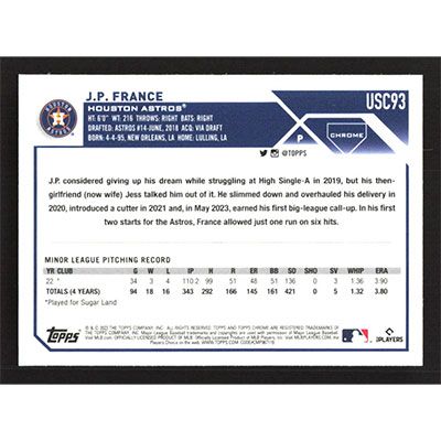This is a 2023 Topps Chrome Update J.P. France baseball card. The card is #USC93 and pictures show condition. Team(s): Houston Astros Rookie Card (RC)