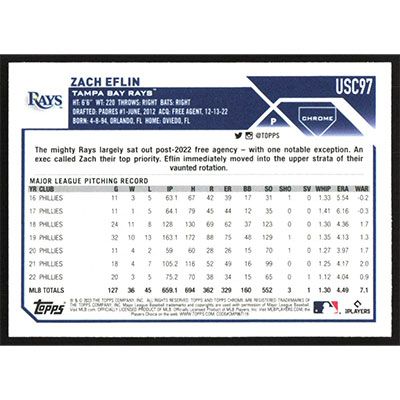 This is a 2023 Topps Chrome Update Zach Eflin baseball card. The card is #USC97 and pictures show condition.