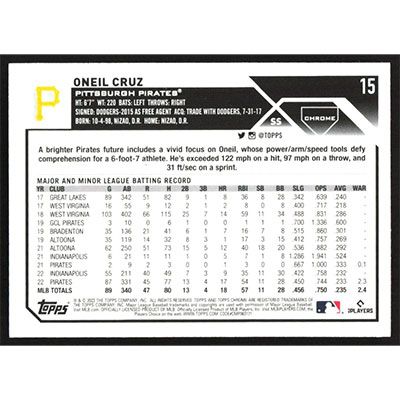 This is a 2023 Topps Chrome X-Fractors Oneil Cruz baseball card. The card is #15 and pictures show condition.