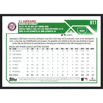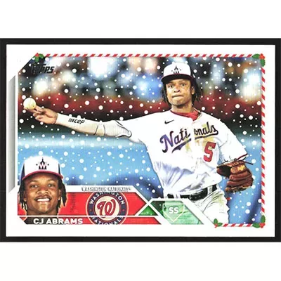 This is a 2023 Topps Holiday CJ Abrams baseball card. The card is #H11 and pictures show condition.