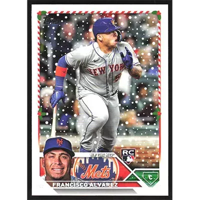 This is a 2023 Topps Holiday Francisco Alvarez baseball card. The card is #H111 and pictures show condition.