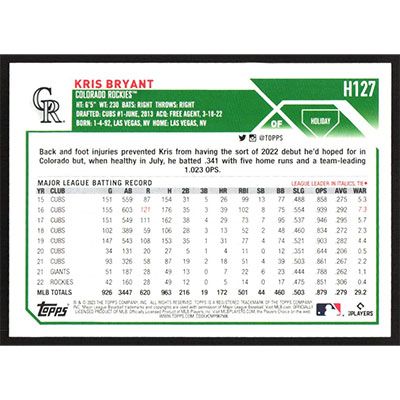 This is a 2023 Topps Holiday Kris Bryant baseball card. The card is #H127 and pictures show condition.