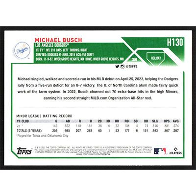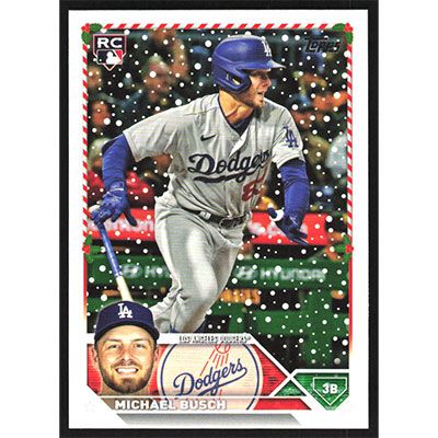 This is a 2023 Topps Holiday Michael Busch baseball card. The card is #H130 and pictures show condition. Team(s): Los Angeles Dodgers Rookie Card (RC)