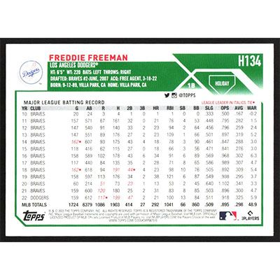 This is a 2023 Topps Holiday Freddie Freeman baseball card. The card is #H134 and pictures show condition.