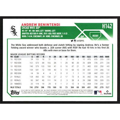 This is a 2023 Topps Holiday Andrew Benintendi baseball card. The card is #H142 and pictures show condition.