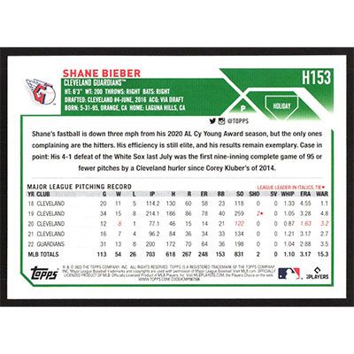 This is a 2023 Topps Holiday Shane Bieber baseball card. The card is #H153 and pictures show condition.