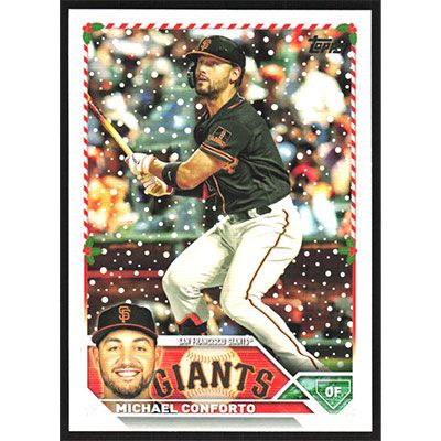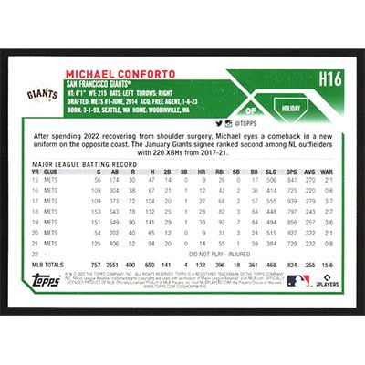 This is a 2023 Topps Holiday Michael Conforto baseball card. The card is #H16 and pictures show condition.